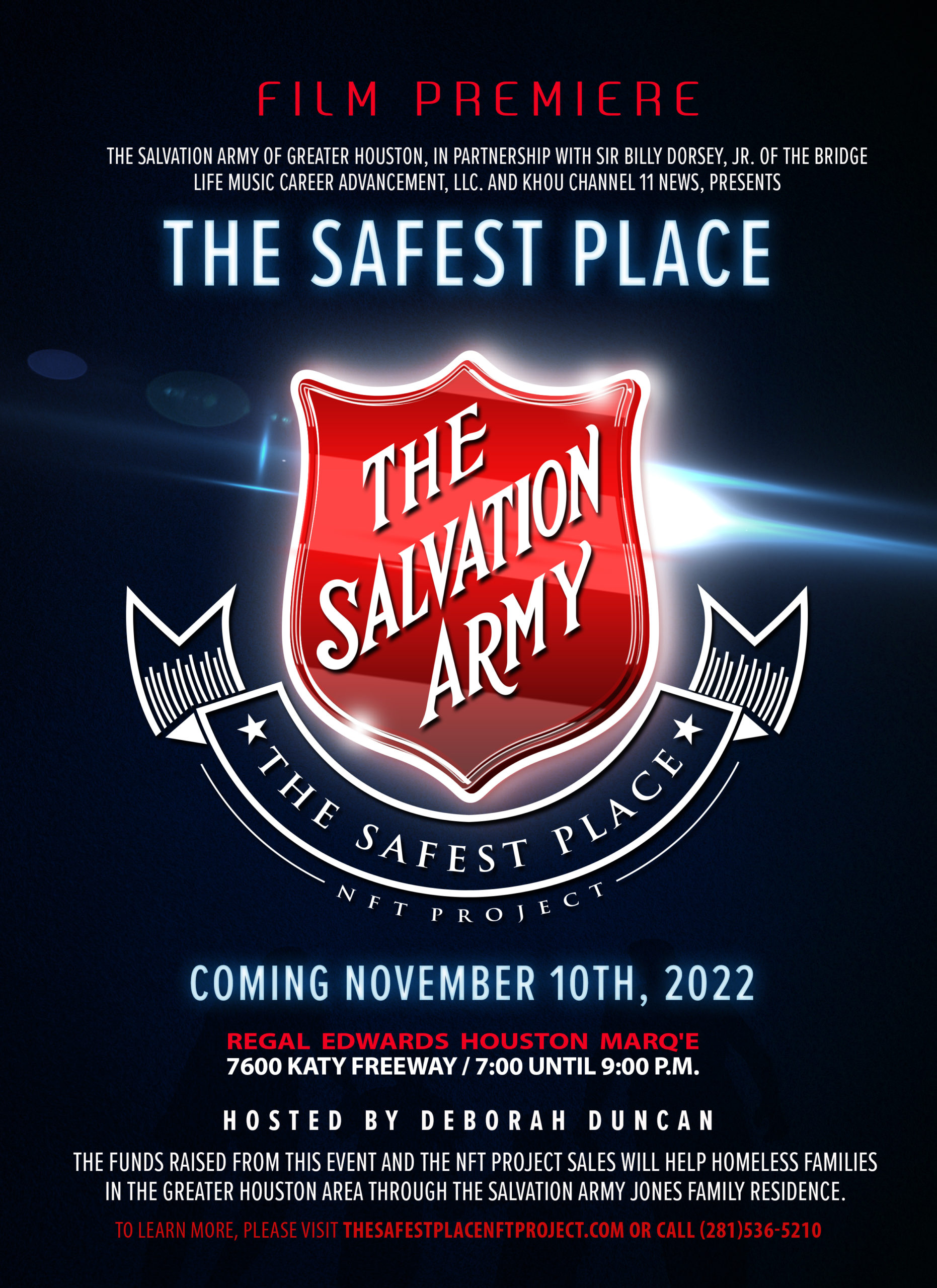 The Safest Place NFT Project is an NFT collection featuring an EP of original songs based on the stories of four families the Salvation Army helped to overcome homelessness (written by Grammy Award winning production company The Bridge Life Music Career Advancement, LLC), along with 10,032 pieces of art representing volunteers from many of the 132 countries around the world where The Salvation Army has a presence, and a red carpet invite (contingent upon seating availability) to the screening of The Safest Place Documentary.